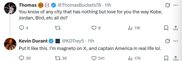 杜兰特:可以这么说,我是推特(X)巨头,我在现实生活中是美国队长,哈哈。
